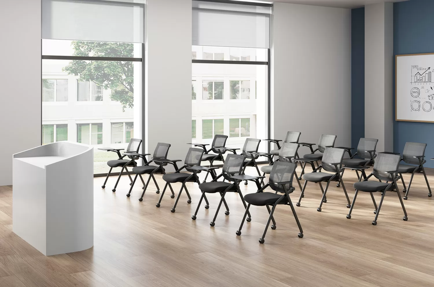 Кресло Clip Easy — идеальное решение для аудиторий, конференц-залов и образовательных центров. Основу конструкции составляет прочный металлический каркас с возможностью горизонтального штабелирования. Спинка выполненная из прочной сетки, имеет эргономичную форму и продуманный угол отклонения 7°. Комплектуется удобными подлокотниками и колесиками для свободного перемещения по помещению, что повышает мобильность пользователя и облегчает организацию пространства.