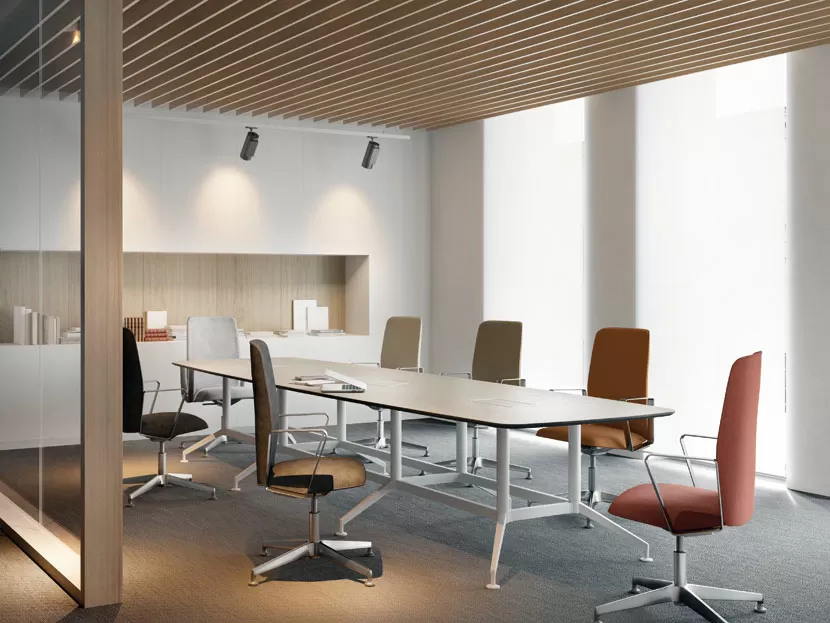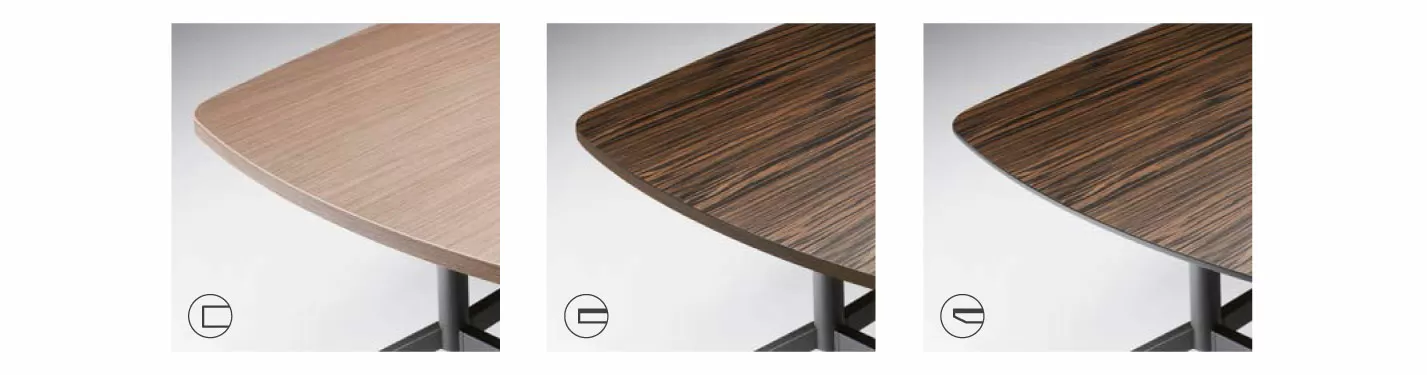 Комнаты для переговоров часто являются местом, где посетители формируют свое мнение о компании. Поэтому в коллекции Drone представлены столы с меламиновым покрытием для рабочих зон в офисе и столешницей из шпона дерева в представительских зонах. Столешница может быть с прямым или скошенным краем.