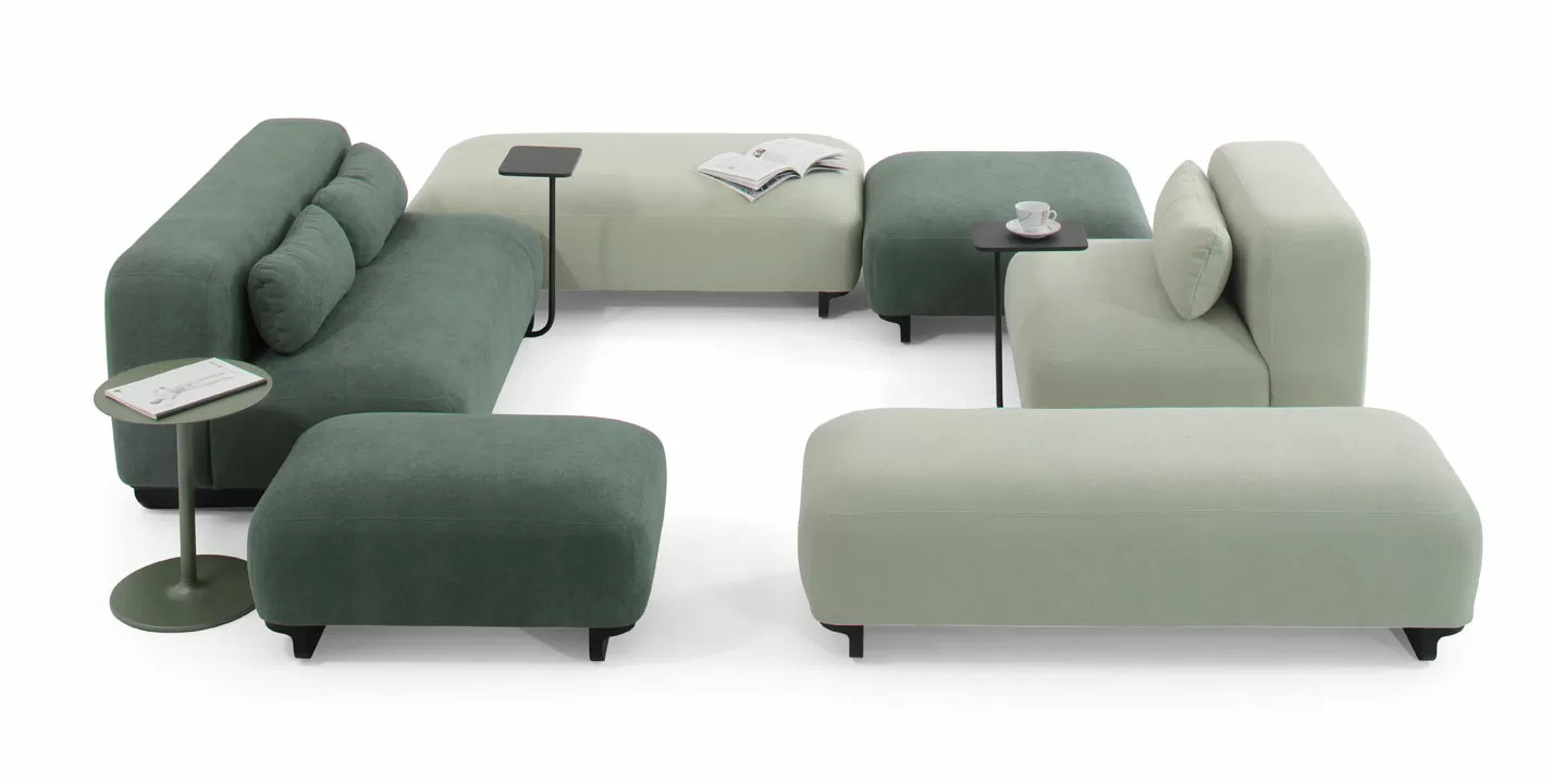 Размеры элементов коллекции позволяют комбинировать их с разных сторон и при необходимости соединять. Пуфы коллекции Just сочетаются с поворотными и приставными столиками, создавая гармоничное и функциональное пространство.