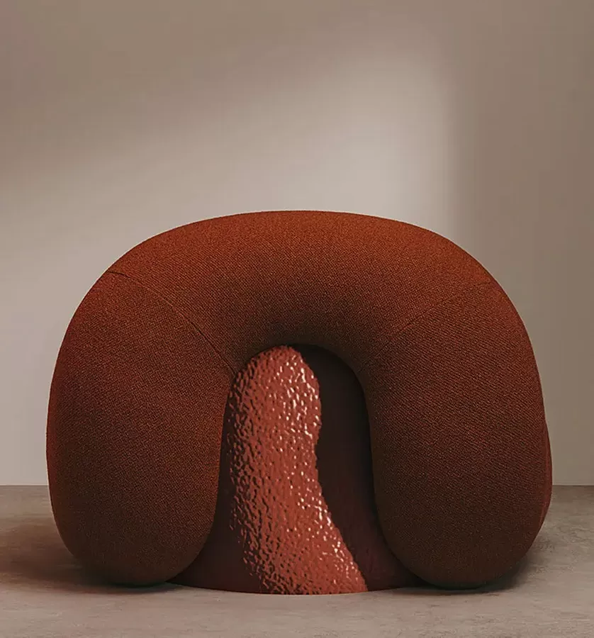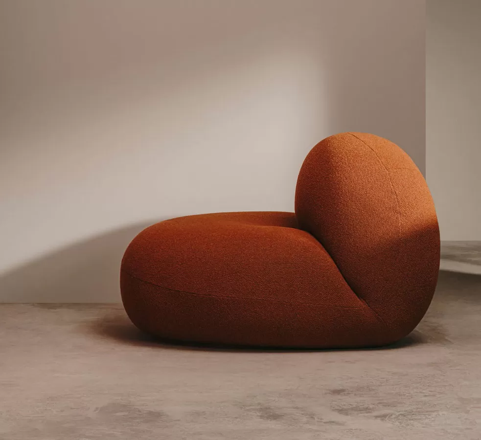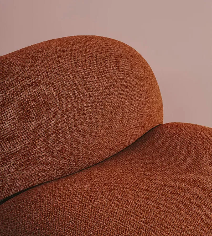Nina Lounge — это объемное кресло, выделяющееся плавным скульптурным силуэтом и сильной визуальной идентичностью. Его форма вдохновлена непрерывной кривой, которая складывается сама в себя, как лента, создавая органическую фигуру, которая обнимает, не «закрывая». Эта обволакивающая геометрия без подлокотников и с широким сиденьем делает модель идеальной и для дома, и для профессиональных пространств. Дизайн отдает дань выразительной свободе мебели 1970‑х, когда смелые формы и тактильные материалы определяли новый «домашний» язык. В этом контексте обивка играет центральную роль: богатая по фактуре и тщательно подогнанная к криволинейной геометрии предмета, она усиливает визуальный и физический комфорт.