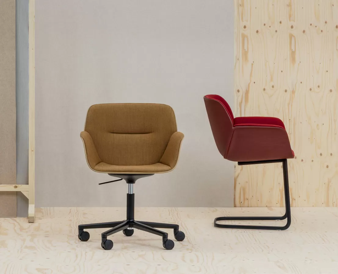 Кресло Nuez предлагает широкий выбор вариантов, что позволяет адаптировать его под различные интерьеры и предпочтения. Коллекция доступна в нескольких вариантах цветов и баз: на четырех ножках, на полозьях, с поворотной деревянной, алюминиевой базой или базой из термопластика, со стальной овальной базой, с колесиками и без. Также можно выбрать обитое сиденье или вариант без обивки.