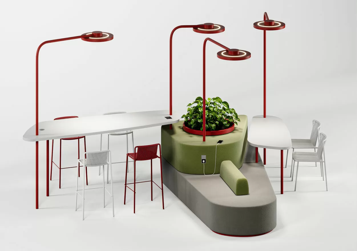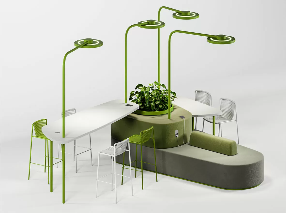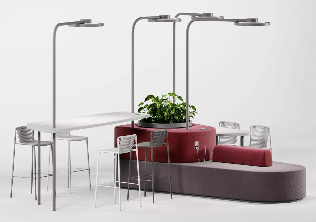 Transit Hub гармонично вписывается в экосреду, сочетая функциональность рабочего пространства с комфортом и социальной атмосферой кафе и зон отдыха. Хаб спроектирован так, чтобы избежать деления зон на основные и второстепенные. Удобные места для сидения, разноуровневые столы, островки зелени, беспроводная зарядка гаджетов, легкий доступ к кофе-поинту объединены в единую концепцию, подходящую для разнообразных видов деятельности — от неформальных мозговых штурмов до сосредоточенной индивидуальной работы.