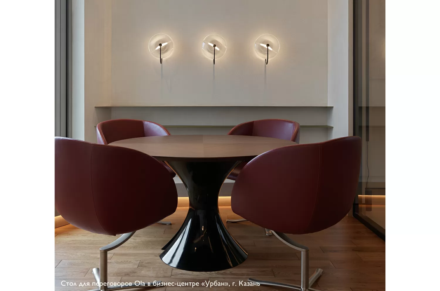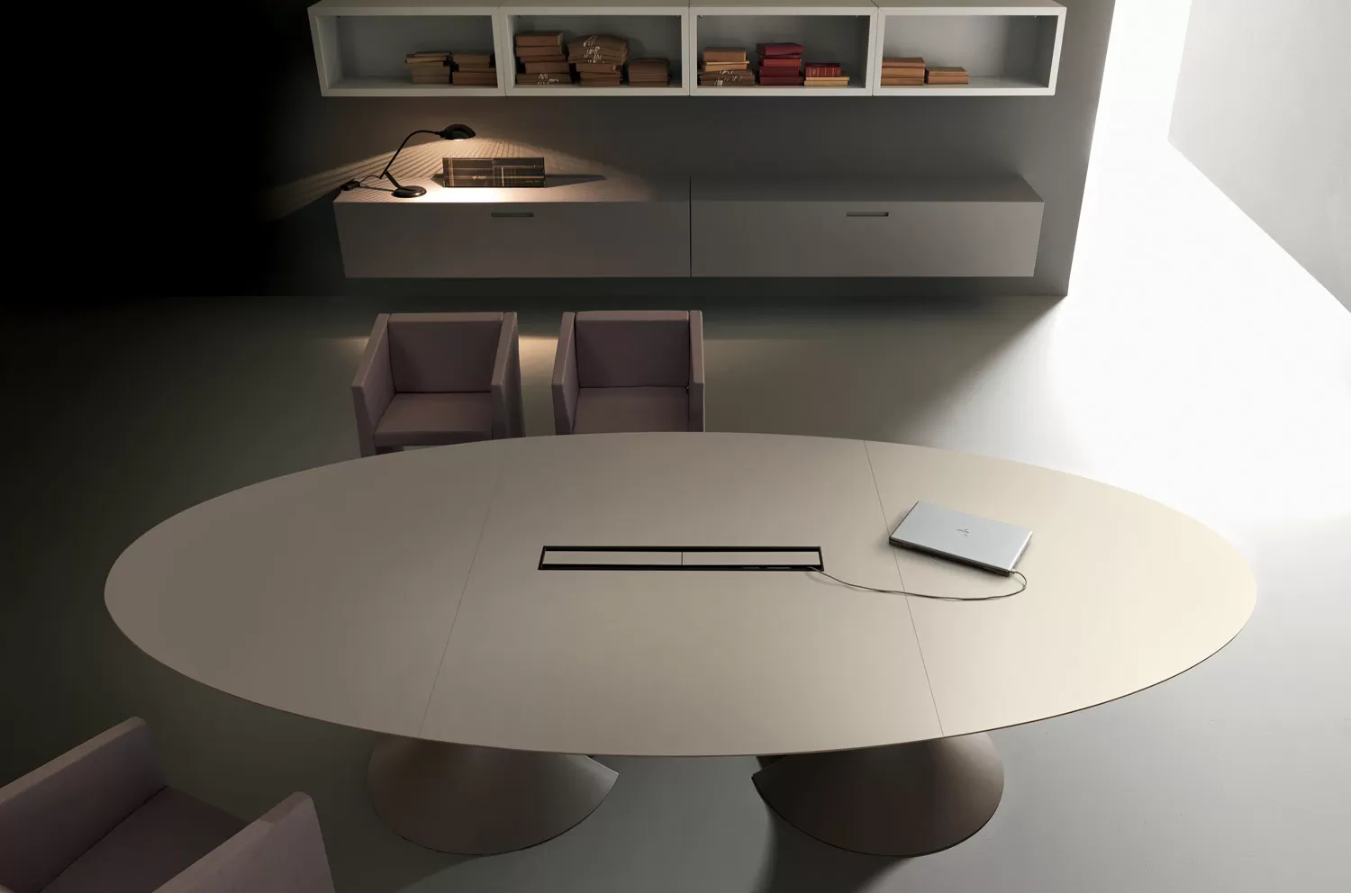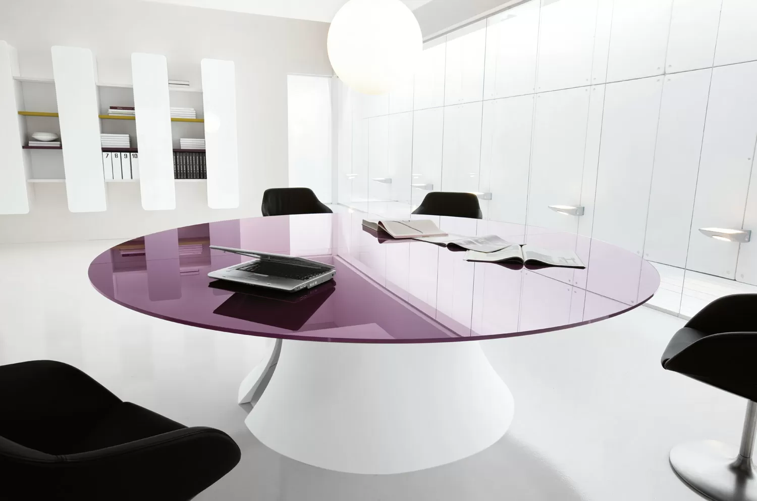 Стол для переговоров Ола от Martex — элегантность, функциональность и безупречный стиль, созданный итальянским дизайнером Марио Маццером. База стола имеет сквозное отверстие центральной части для удобного размещения проводов электрификации. Белые глянцевые опоры выполнены из Cristalplant® — композитного материала, позволяющего создавать формы, недоступные для керамики или натурального камня. Бархатистая текстура — ключевая особенность материала.