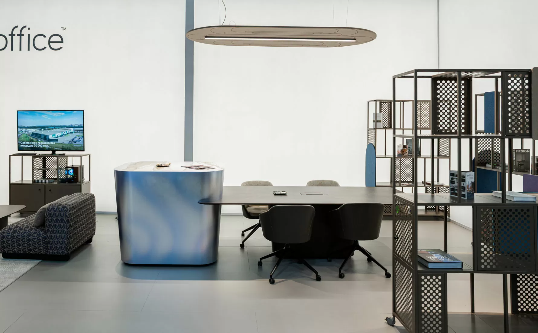 Наша экспозиция задумывалась как манифест современного пространства. Главной задачей было продемонстрировать принцип универсальности: посетители смогли воочию убедиться, как представленная мебель интегрируется в любую среду — от корпоративного офиса до частного интерьера. Гибкость отделок и богатство материалов — шпон, эмаль, металл и камень — стали основой для индивидуальных решений, которые мы воплощаем на своем производстве полного цикла.