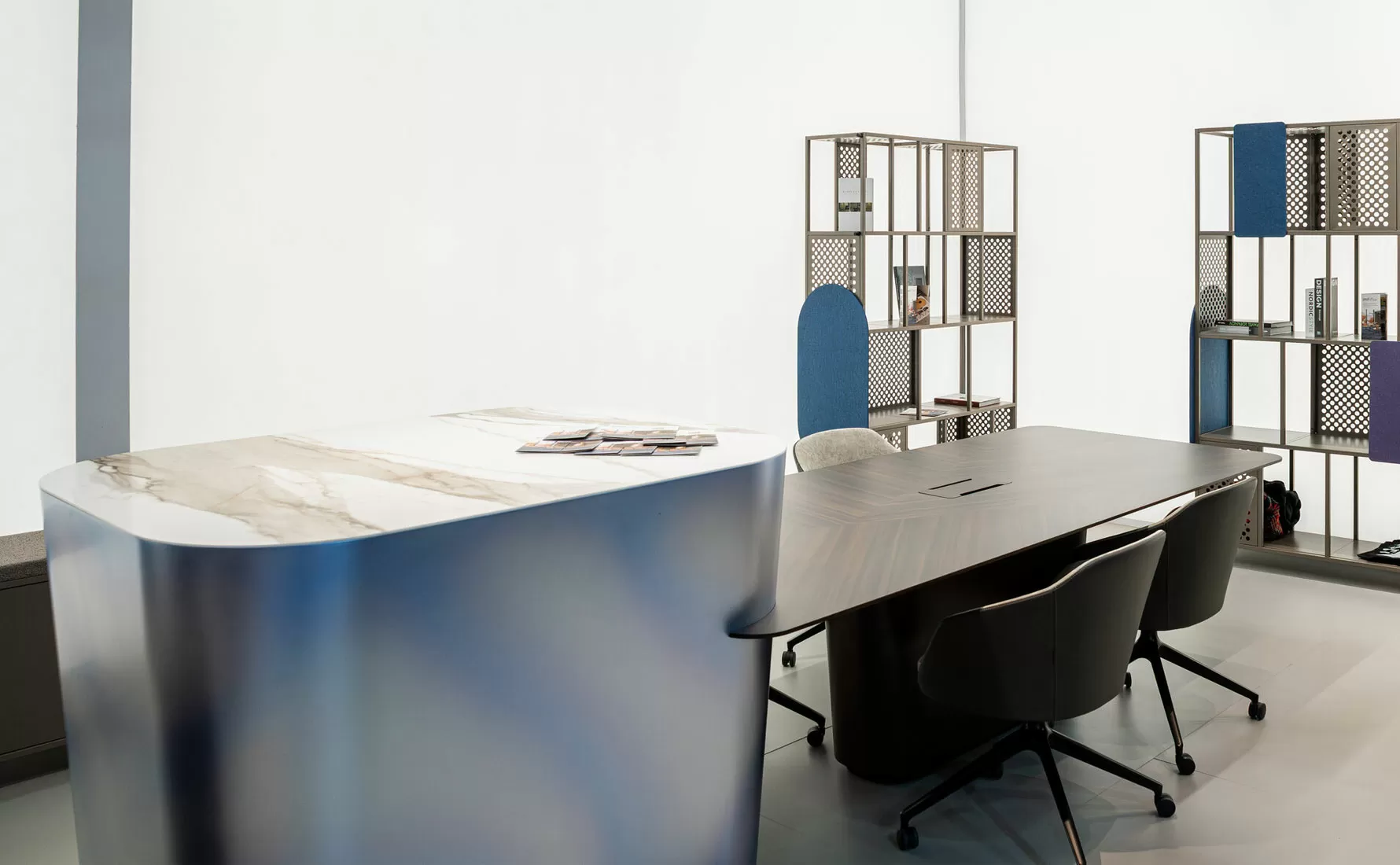 Центром притяжения внимания стал двухуровневый стол индивидуального изготовления. Он выступил визуальной аллюзией на два формата делового общения: строгие переговоры «лицом к лицу» и неформальный диалог у барной стойки, снимающий излишний формализм. В изделии искусно сочетаются шпон, эмаль, металл и камень, демонстрируя возможности кастомизации.
