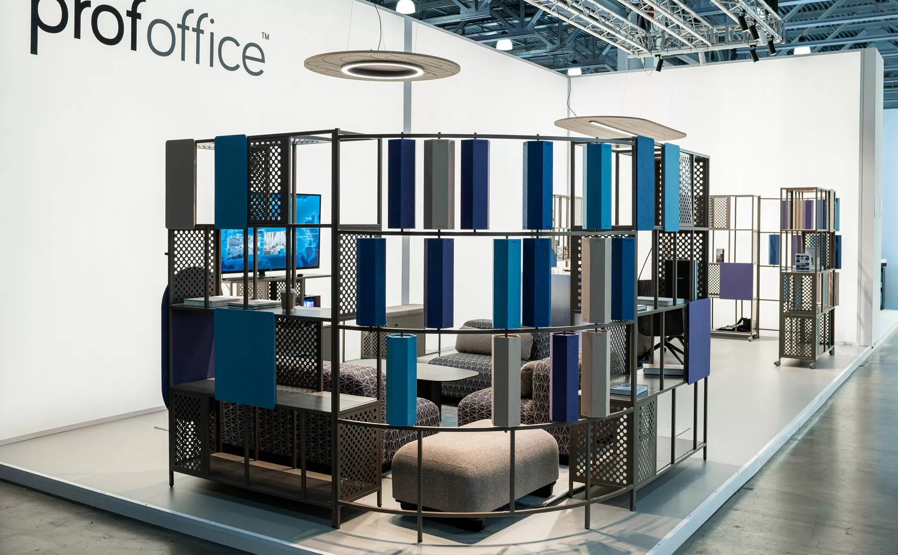 Коллекция предлагает глубокую кастомизацию. Панели могут быть выполнены из шпона, металла или фетра. Если шпон и металл работают на визуальный стиль, то фетровые поверхности берут на себя задачу акустического комфорта, поглощая шум в open-space. Специально к выставке мы представили расширенную версию системы: сервисные тумбы, радиусные элементы и акустические вставки сделали Mindframe еще более функциональной для зонирования.