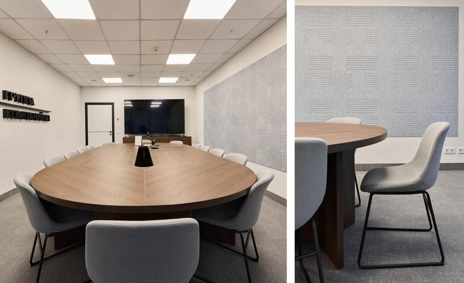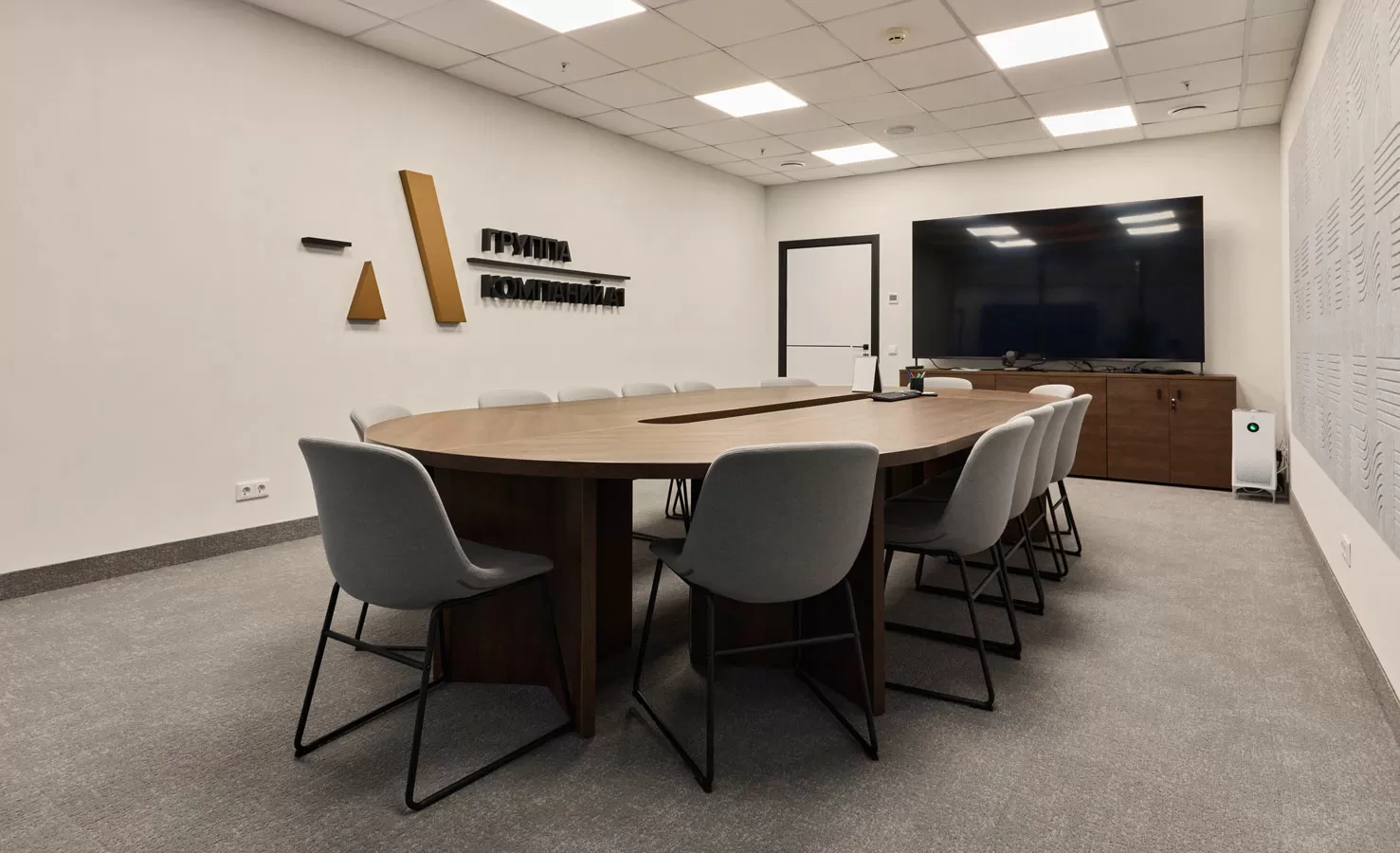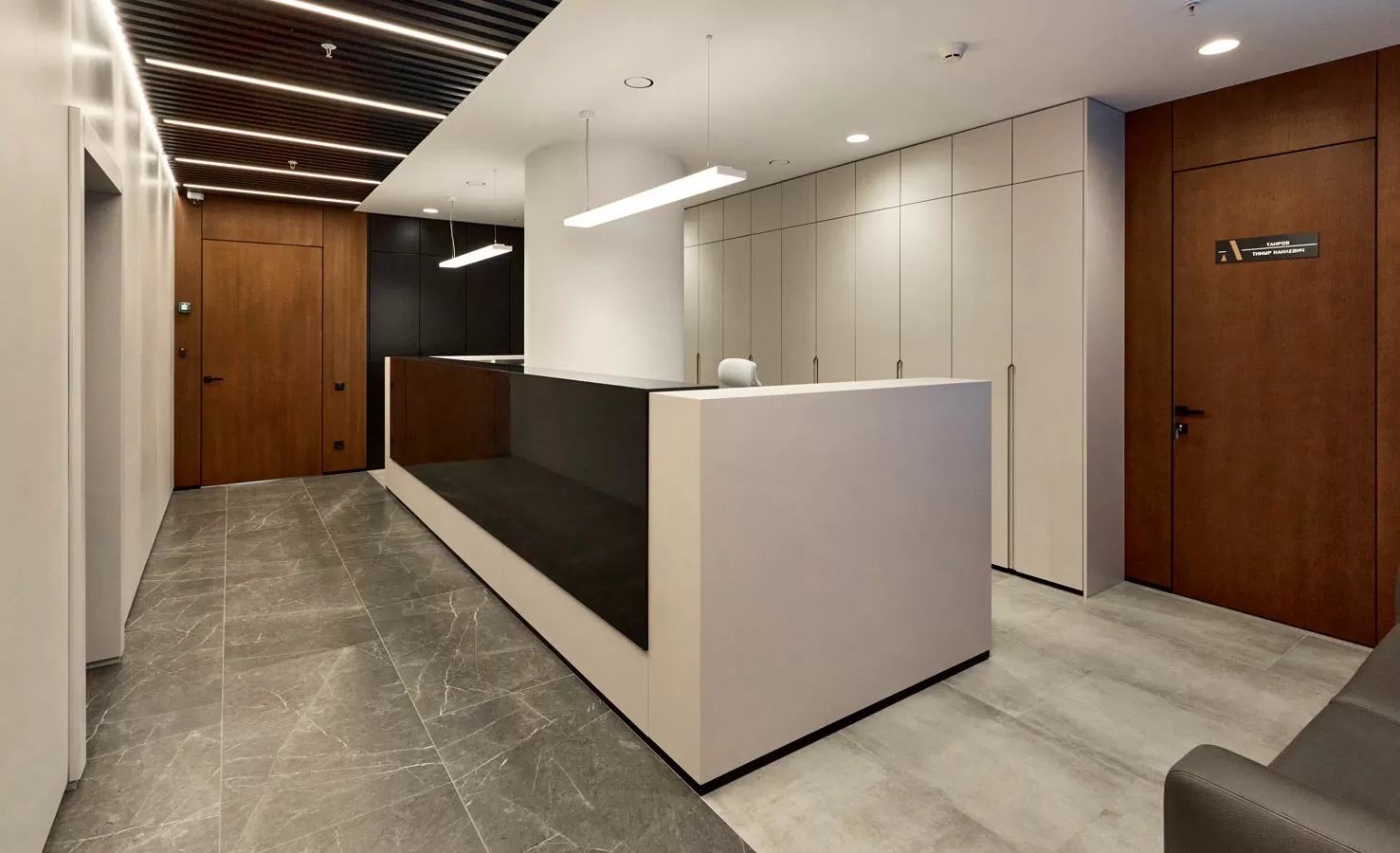 Мебель: рабочие станции Tour, столы переговоров Lava от Involux (Белоруссия) и Astro от Solo (Италия-Россия), кабинеты Rola от Involux (Белоруссия) и Murano от Solo (Россия), кофейные столы Noale от Solo (Россия), Coffee Neo от RF Group (Италия), Festa от Solo (Италия-Россия), кофейные столы и стол переговоров от ТОК Мебель (Россия), зоны хранения, шкафы, приемная стойка индивидуального изготовления