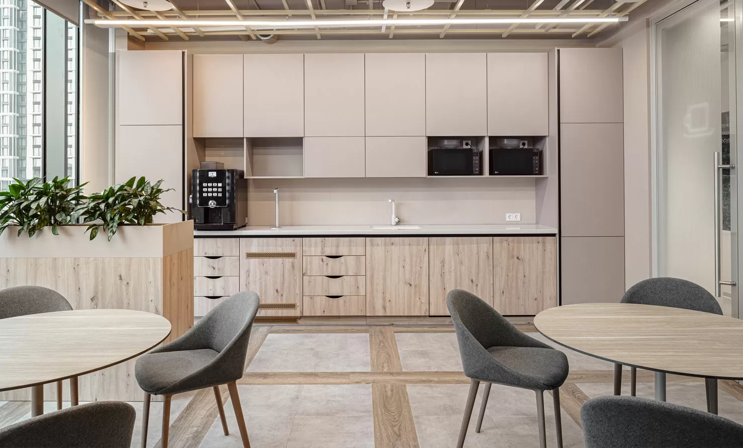 Кроме того, массивные пилоны вдоль фасада облицованы индивидуально разработанными фетровыми панелями, которые не только выполняют декоративную функцию, но и значительно улучшают акустический комфорт в рабочей зоне. Дизайн офиса полностью поддерживает задачи компании по созданию комфортного и вдохновляющего пространства для сотрудников.