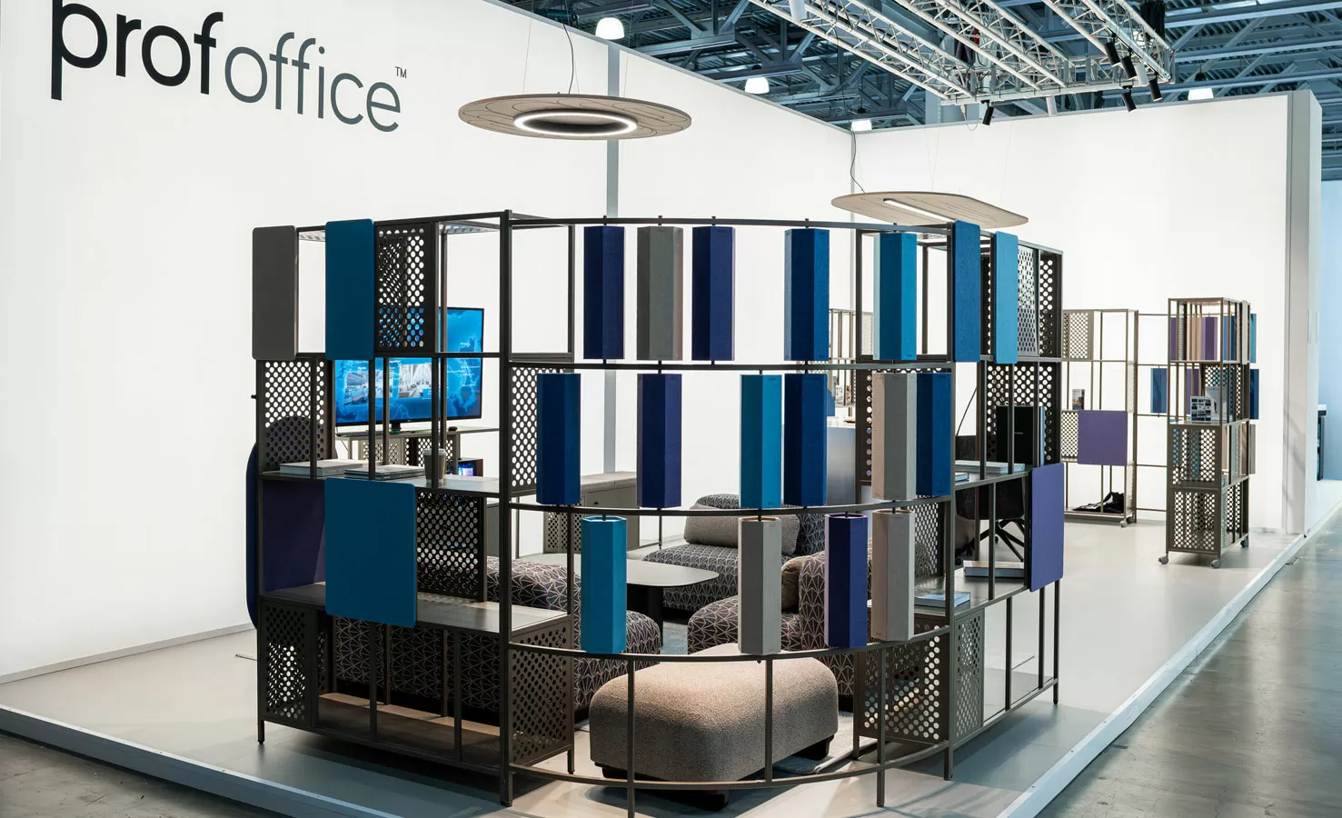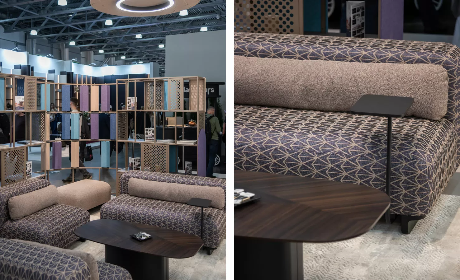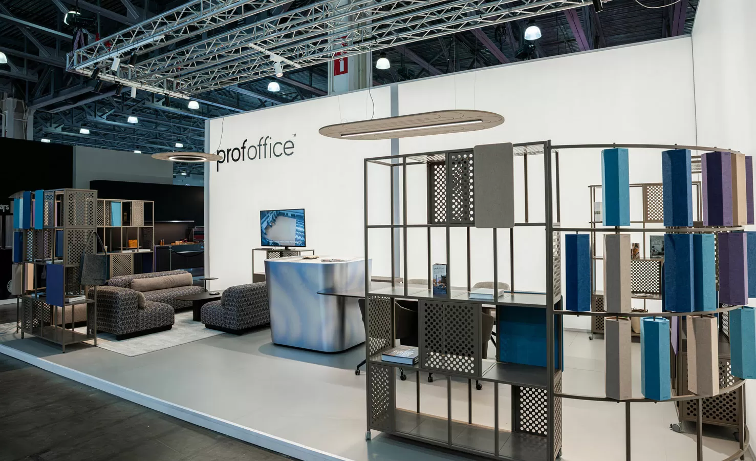 На стенде показали модульную коллекцию стеллажных решений Mindframe, созданную в сотрудничестве с архитектором Фёдором Ращевским, акустические светильники Lint Acoustic и Halo Acoustic со звукопоглощающими панелями и управлением через Bluetooth или протокол DALI. Центром экспозиции стал двухуровневый стол индивидуального изготовления для переговоров и неформального общения, дополненный модульными диванами Just.