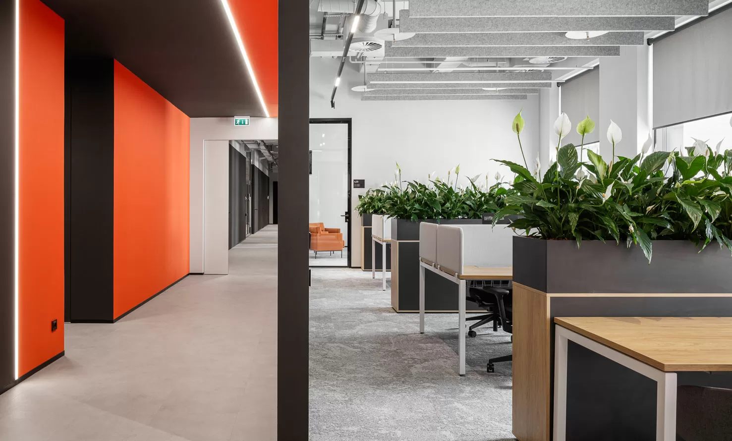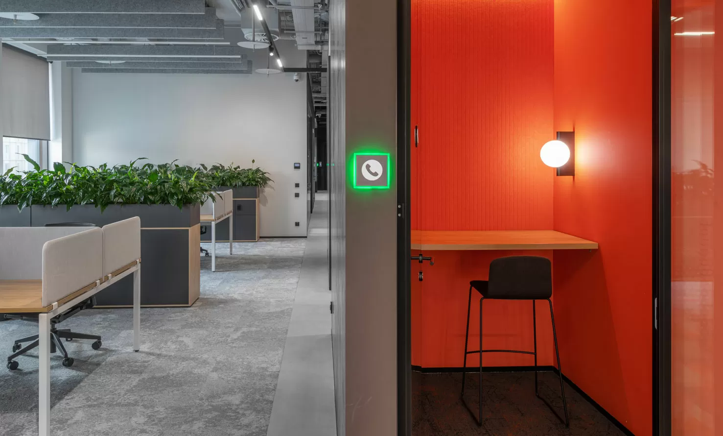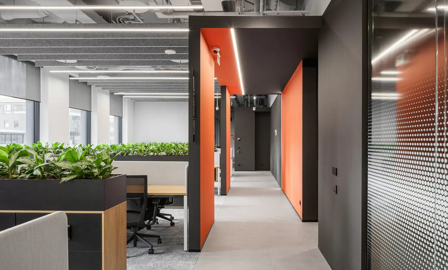 Solo предоставила мебель и кресла, обеспечивая удобство работы и легкость взаимодействия между коллегами. В общественных зонах, оформленных мягкой мебелью и кофейными столиками от Solo, преобладают яркие оранжевые и контрастные черные цвета, создающие динамичную атмосферу. В рабочих зонах использованы светлые и спокойные оттенки, которые гармонично сочетаются с зелеными зонами-баффлами, создавая комфортное пространство для обучения и развития.